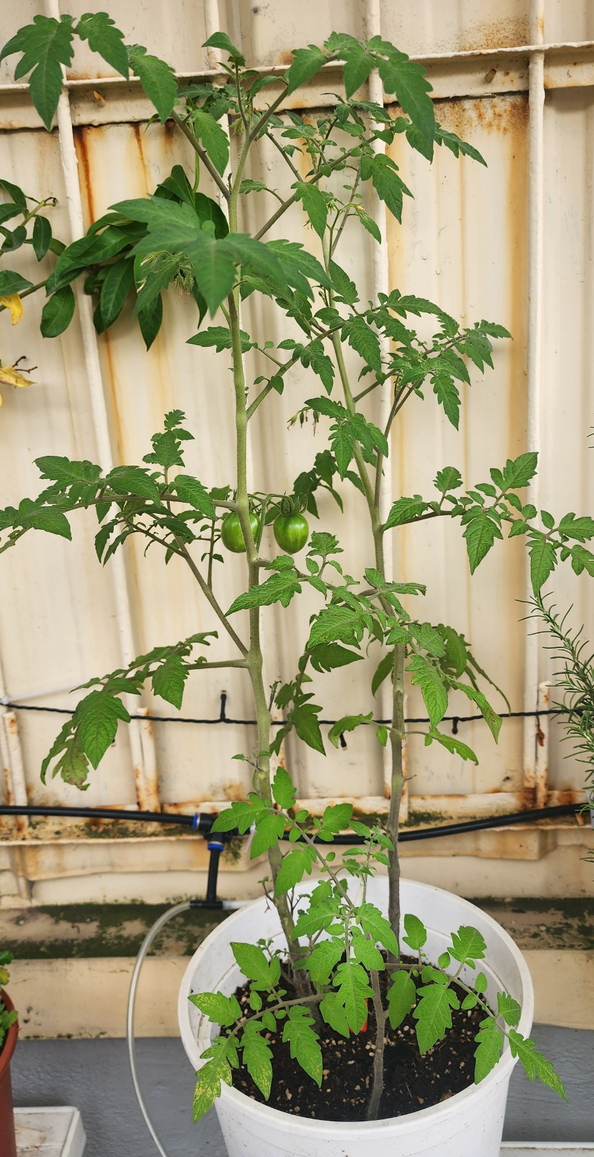 這三棵番茄樹是小鳥叼來的種子, 自行長大的, 前一陣子從網路上買的番茄種子, 得了黃葉病死光了, 但這三棵外來的番茄樹卻生意盎然, 目前結了兩顆番茄, 但願是甜的。