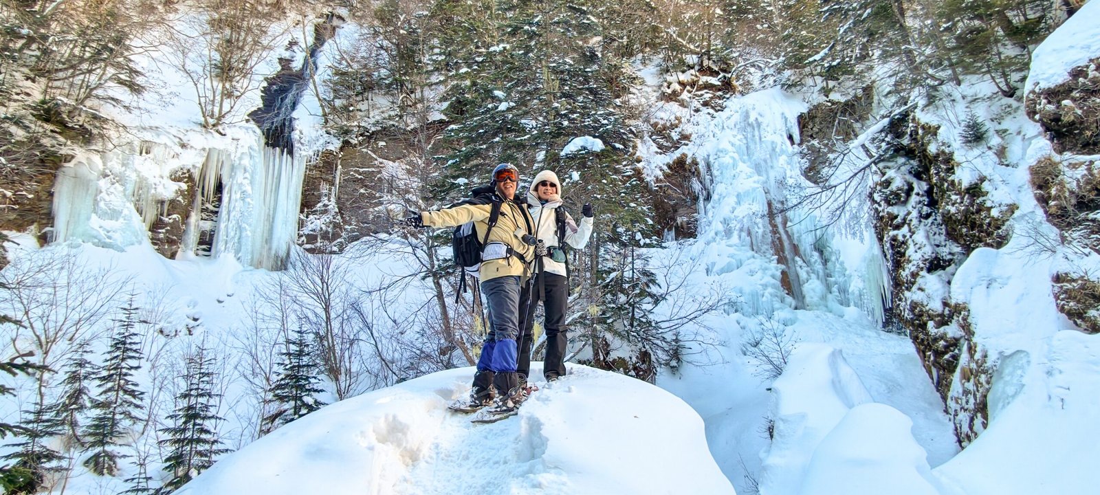 今天的三本瀑布更壯觀了,這附近雪深一公尺,我們走在結冰的河道上往三本瀑布走去,大自燃造物的神奇令人嘆為觀止,如果台灣的緯度跟日日本一樣,我們的高山鋪上白雪,一定比日本更美。