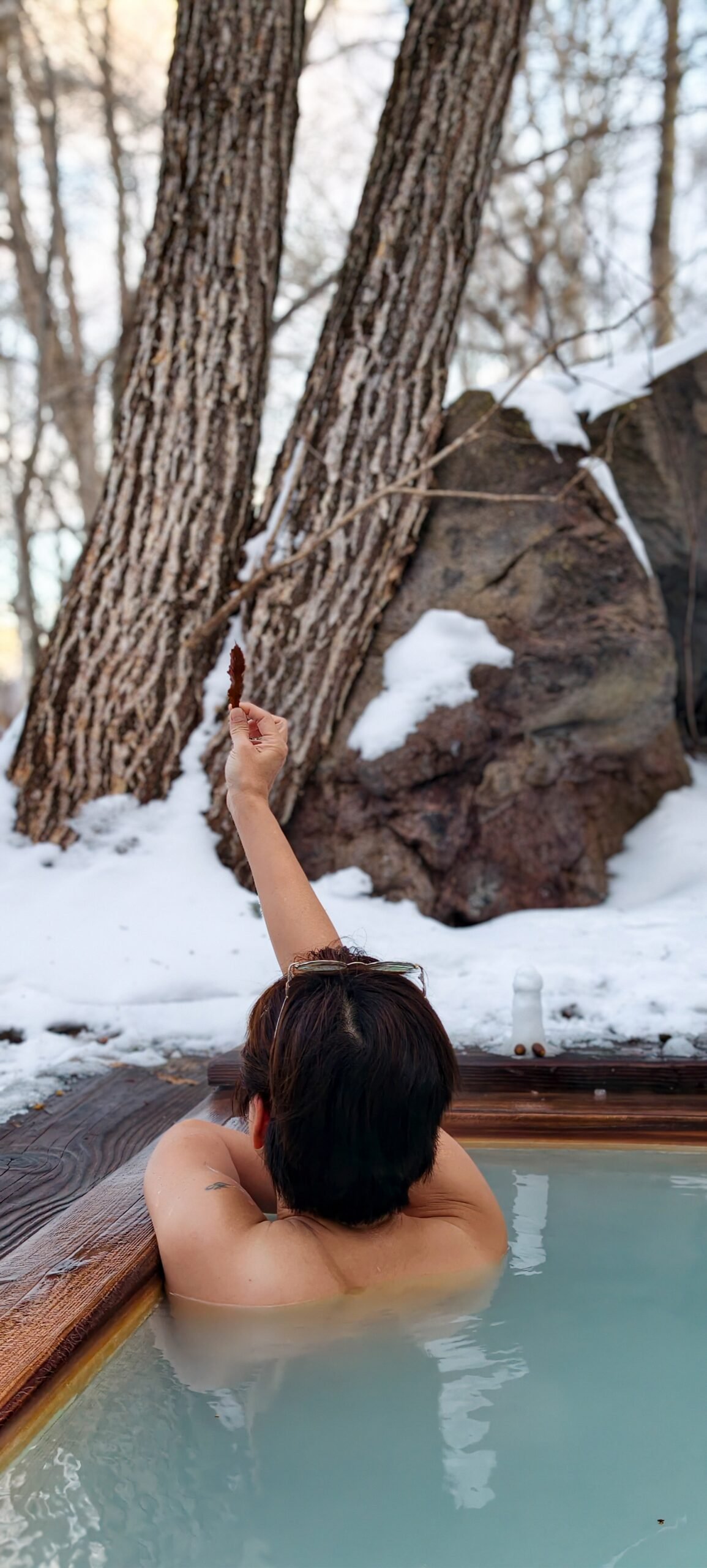 在黑黑下雪的夜中泡溫泉,隊友問如果看到兩個亮亮的眼睛出現,她說她應該會把頭埋進溫泉裡,我只想拔腳光著身體逃跑。