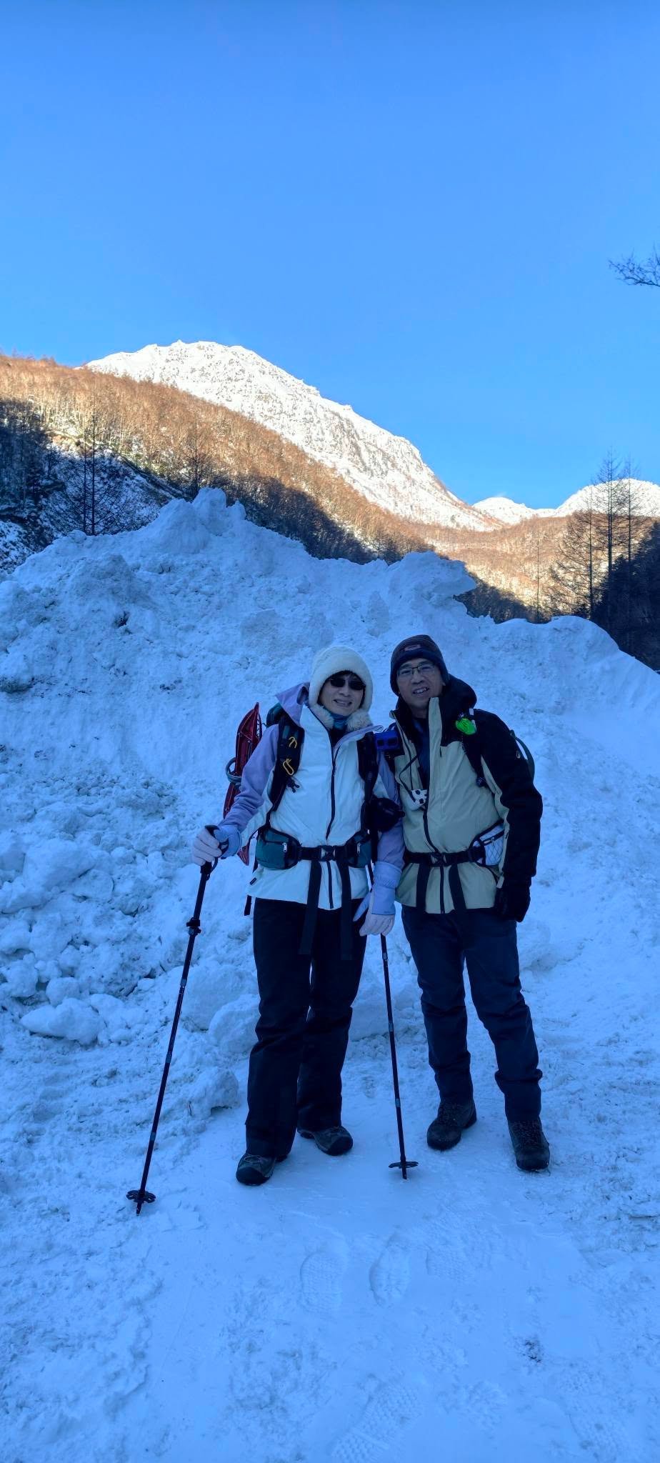 我們這個民宿業者經過認證,可以在冬天帶團進入上高地,如果是個人,可能得租車來到這裏,一開始會經過兩個長長的隧道,冬天的時候車子無法進去,個人車輛只能停在隧道口,兩個長長的隧道,坡度大概是12度,加起來應該有兩公里長,這個行程來回大概是8公里,我們與兩個外國情侶,跟著民宿業者的Okinawa美麗女導遊,就在零下負十幾度的雪地裡健行。
