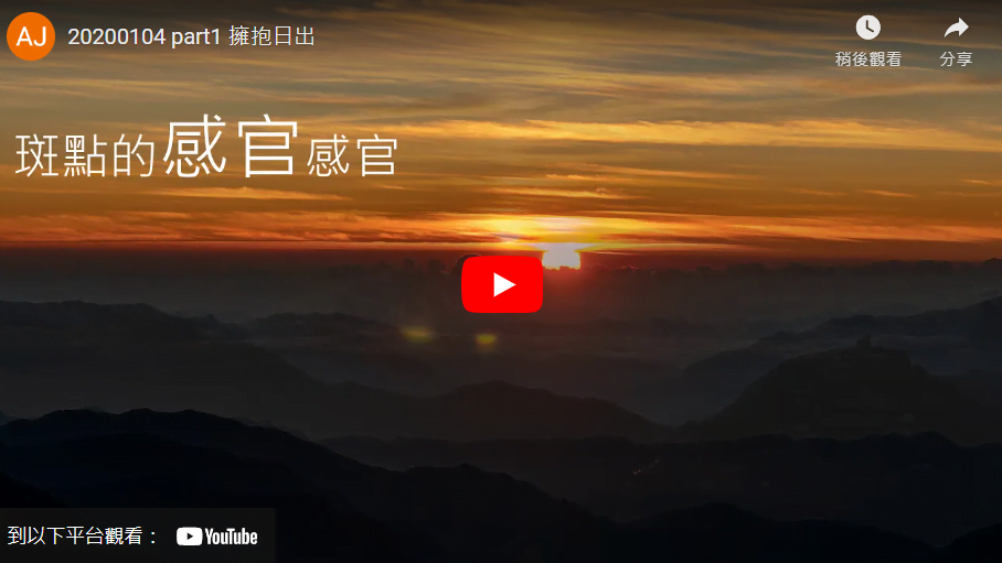 夏宇,擁抱 2020/01/01玉山擁抱日出。作了一首朗頌詩,用最愛的夏宇,擁抱一詩。歡迎來聽切成溫柔版本的J哥朗頌詩歌,麻煩戴上耳機,因為外頭的世界有很多妖怪。Recite: AJMusic: 西村由紀江/月いろのつばさ風是黑暗門縫是睡冷淡和懂是雨突然是看見混淆叫做房間漏像海岸線身體是流沙詩是冰塊貓輕微但水鳥是時間裙的海灘虛線的火燄寓言消滅括弧深陷斑點的感官感官你是霧我是酒館#請開2160p Share 0