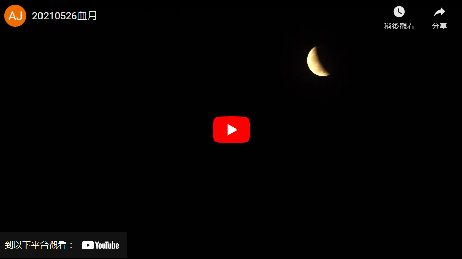 我的血月影片 前天的血月,34分鐘錄影,不想濃縮了就這樣。4k高畫質,請開最高畫質。人生第一次看月亮,慢慢上升不到一小時從虧到盈,好療癒啊~還有聽聽我喜歡所配的交響樂喔,如果一個人無聊可以邊看月亮邊聽音樂喔。https://www.youtube.com/watch?v=1dB5KJKisj8 Share 0