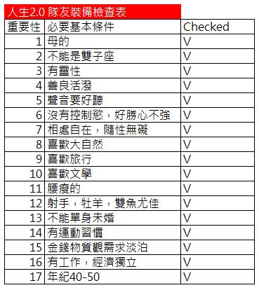 人生2.0隊友裝備檢查表 終於把心中預設不太明確的人生2.0隊友的選擇條件,清楚明列出來了~(工程師性格無誤),這些條件本來以為我會孤獨終老,不過總算出現一個神蹟。😁難怪能一見鍾情,已經變成我的心頭肉,因為每一塊都達標了。🥰Checked *17 ❤檢查表只是開始,當然之後兩個人在一起最重要的,是心意相通,可以無話不談,能一起成長呢。#是的我就是在曬恩愛🤣#Honey說她沒有選擇條件是不用頭腦想的#是用外星人感應到我很OK就准了🤣 Share 0