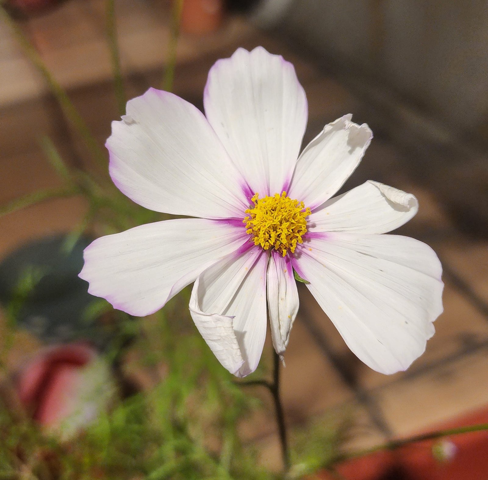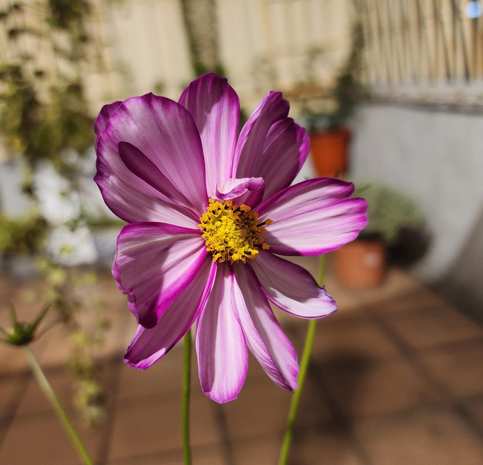 半紫焉紅的波斯菊正式接手了,白色的第一朵菊花,慢慢結束她短暫又燦爛的一生了。