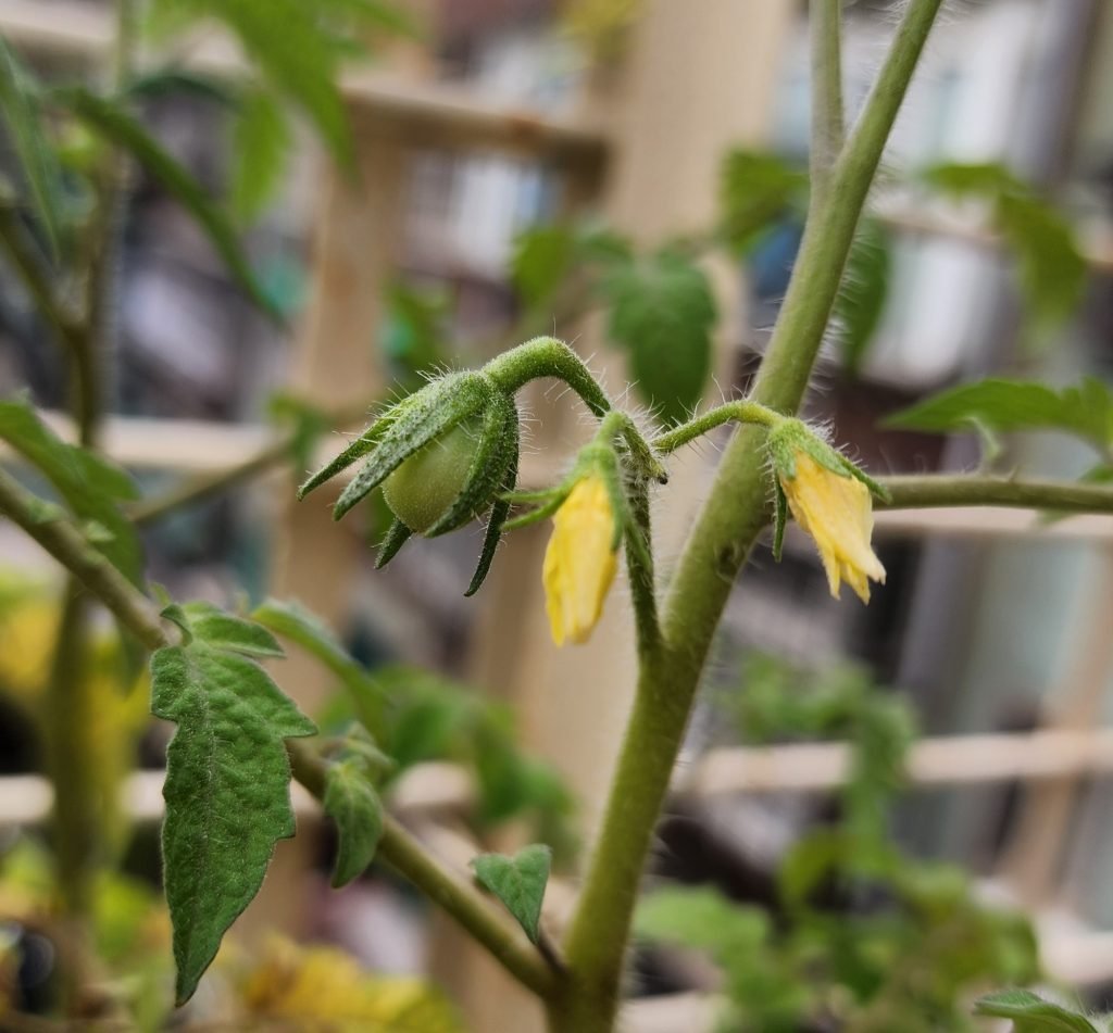 一早發現其中一盆長出番茄果實了,這將是我們花園的第一顆水果,不知道它什麼時候被授粉的,這孩子在昨晚被剪除黃葉子之後,可能就沒有burden地勇往直前了。