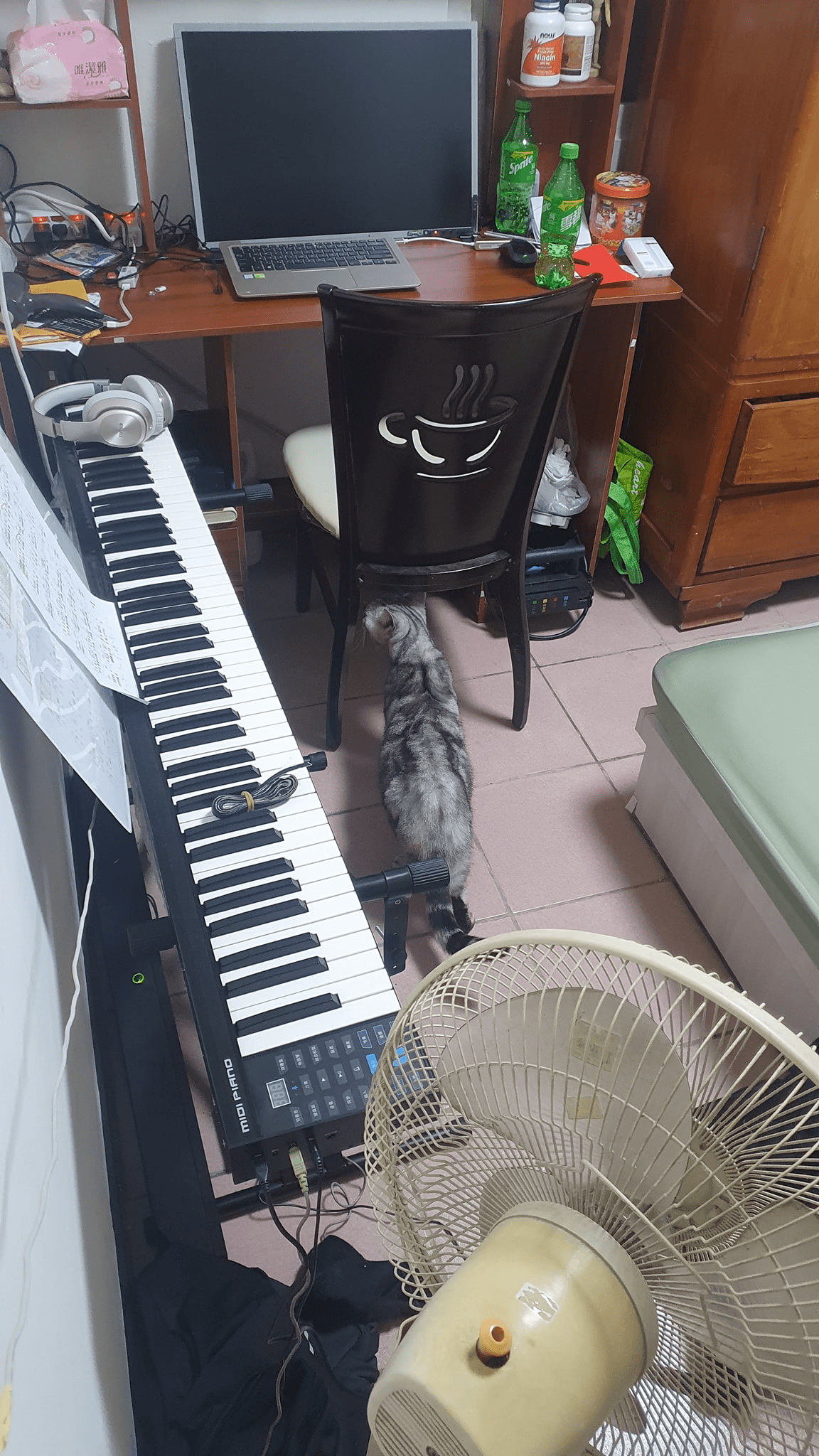 我也跟著進來坐在我的床上,看著牠到底下一步是什麼,會跳上我的書桌,還是跳上我的鋼琴上,發出那一鍵的聲音而嚇一跳,但是後來都沒有,牠仍然無視我的存在,安靜地從椅子上跳下來,穿過我的腳從門口出去了。