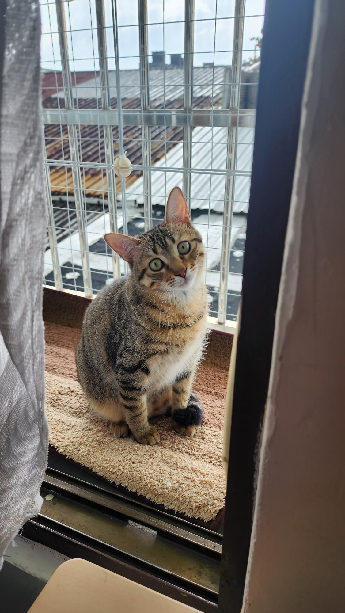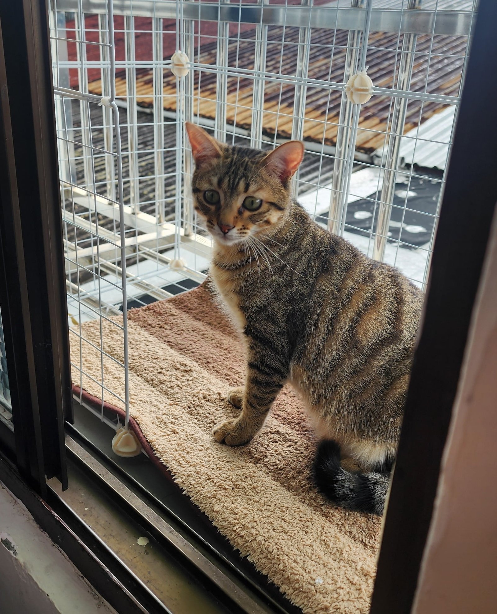 斑斑的月台 這假日幫斑斑在房間的外窗外裝了一個月台,怕他不小心跑出去了,用拼裝的鐵架固定隔了一個小空間給他,他終於可以在這個月台曬太陽,看月亮,看野生火車貓與火車鳥來來去去了。抱歉斑斑我不能讓你搭他們的火車離開,雖然火車站外頭看起來很好玩,但是外頭很危險,要跟其它的野貓搶食物,下雨的時候也沒有地方避雨,雖然外頭可能有你的小女朋友,但是她們住在野外一定很兇,你一定搶不贏其它野生猛男的。我很抱歉,你的一生將在這個房子裡渡過,這個月台是我們僅僅能夠給你的,挖出來的世界一角,我們無法給你更多了。 Share 0
