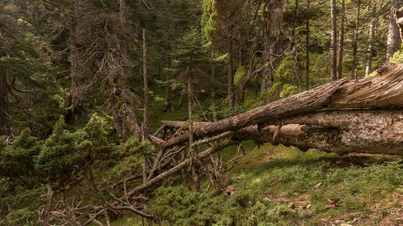 原來稍早時黑森林的出口已經變成了入口,我記得海葵在海中也是這樣吞吐的,黑森林就像是一隻海葵,我們都是一群蜉游生物,等著被它消化,最後再還原回來我們原來的樣子。白天的黑森林非常美麗,是臺灣海拔最高的冷杉純林,這種林相聽說不輸歐洲,到處攀生倒蹋橫陳在路上的斷樹,看起來都是雷神索爾前幾集的傑作。這些林相在稍早夜探時完全無法想像,怎麼會有人認為它很可怕,我在黑森林的下坡路上特別放慢腳步在走,中途頻頻休息,享受一個人擁有一座森林的特權,甚至我到了一個比較平坦的台地上,我放下背包,特別靠著樹幹睡了一會兒。醒來的時候,沒有看見巫婆,沒有會走過來的蘑菇,沒有看見紅衣小女孩,也沒有臺灣黑熊與水鹿,連魔神仔都懶得理我,森林還是一樣安靜,連樹葉磨擦的聲音都沒有,只有關節磨著自己的聲音。