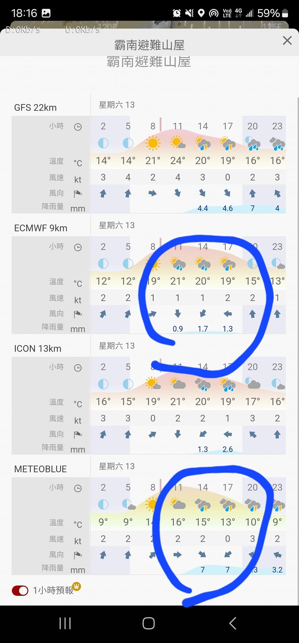 因為metroblue預測下午兩點有7mm ,但是ECMWF-9km只有0.9mm,跟隊友討論後決定還是謹慎一點,決定0200從武稜山莊出發,因為第一天要噴到霸南山屋,結果被一日玉山九座的宇宙神隊友狂操到,1200到霸南山屋,整個人快往生,他算了一次大約上河七折,真難為他四五折的速度了。